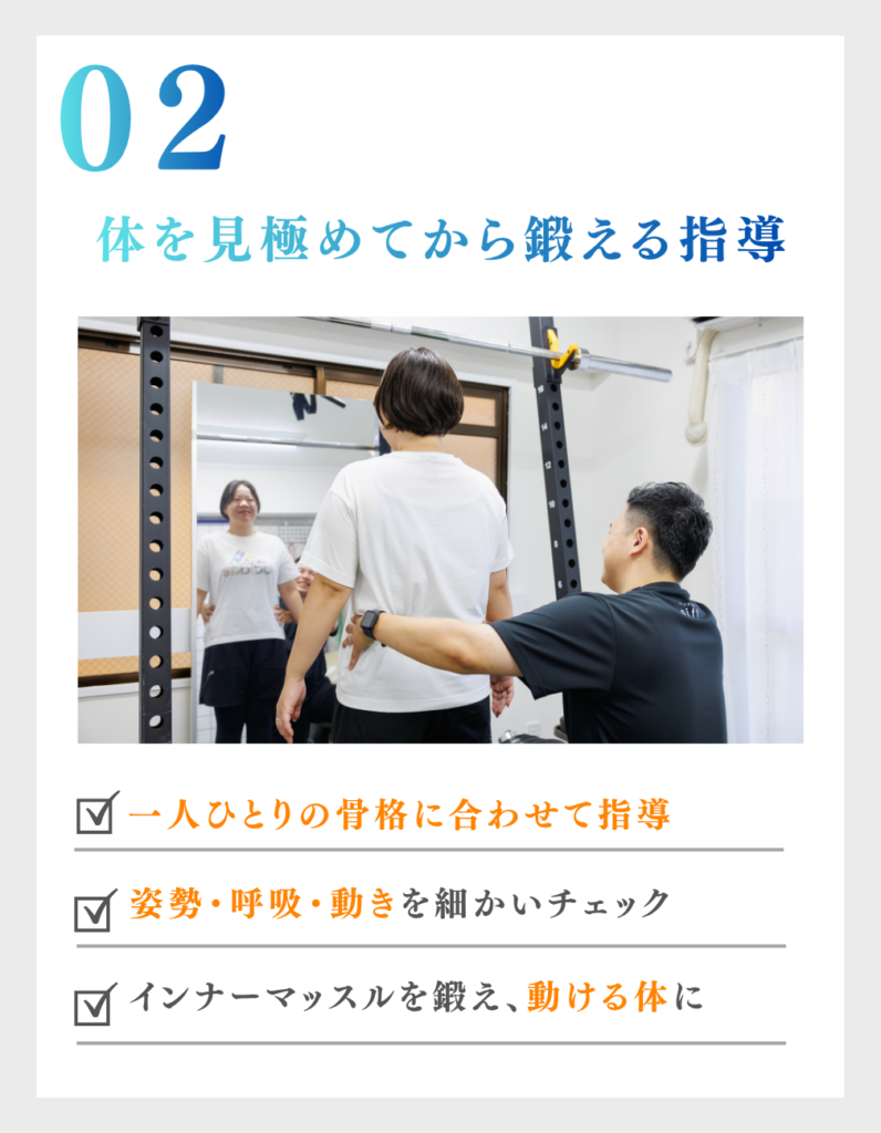 当ジムでは、マンツーマンで1人ひとりに合わせたトレーニング指導を実施しているため、初心者の方も安心してお越しください。